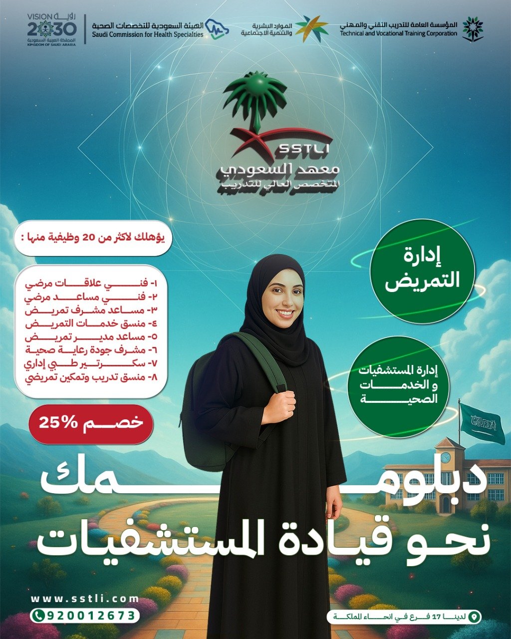 دبلوم ادارة التمريض برنامج تدريبي معتمد 75 ساعة، يهدف لتأهيل الكوادر بالمهارات الإدارية والصحية لإدارة فرق التمريض والمرافق الطبية بما يتوافق مع احتياجات سوق العمل.